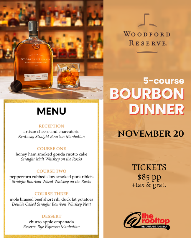 Join us for an unforgettable evening featuring a five-course dinner perfectly paired with the rich, complex flavors of Woodford Reserve Bourbon Whiskey. Each course is thoughtfully crafted to highlight the distinctive notes of this celebrated Kentucky bourbon — from its warm vanilla and toasted oak aromas to its smooth, refined finish.